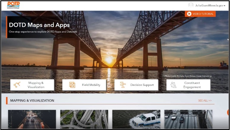 The System of Engagement was built on three fundamental insights. First that most Departments of Transportation had already made significant investments in various information systems, whether ERP systems, or asset and maintenance management systems, but that very few in these organizations had access to that data. This is what a colleague calls “the last mile” in data delivery: providing information to workers when they need it, where they need it, and in context to their job, so they can be more productive. So the starting point of a System of Engagement is to create a single location for users (with appropriate permissions) to access authoritative data, using any device at any time. This is a different concept from the traditional data warehouses and the like and rather focuses on making accessible existing data sources through services organized into easy to use data portals. The portal for the Louisiana Department of Transportation and Development (DoTD) is illustrated below: