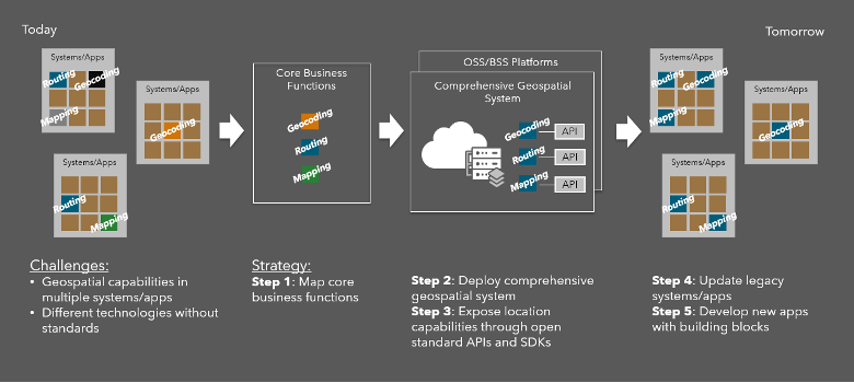 But within the industry today, much like other legacy systems and apps under the OSS/BSS umbrella, there are legacy mapping and GIS systems that are siloed point solutions that lack interoperability with other apps. So as new digital ecosystems are architected to support NextGen OSS/BSS, CSPs should consider geospatial strategies that leverage open and interoperable geospatial systems that can provide standardized location intelligence. Geospatial systems that align with an open API vision and can offer an architecture that fits a bare metal deployment, a cloud native deployment, or a hybrid deployment. By implementing a geospatial strategy and standardizing on an open geospatial system, organizations can reduce technical debt of legacy mapping and GIS tools that are not reusable assets for new business applications and processes. Many organizations are following a similar geospatial strategy as shown in the figure below.