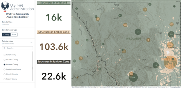 WUI Fire Community Awareness Explorer: This dashboard provides a quick snapshot of counties or places in the U.S. and maps exposure to wildfire hazards for structures in the WUI. Users interested in building fire-adapted communities and resilience can quickly identify vulnerable structures or areas in the WUI to help inform community risk reduction planning and targeted outreach efforts.
