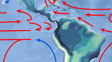 An elevation map of an island in blue and green overlaid with red and blue arrows marking currents, with two small photos of students in classroom settings