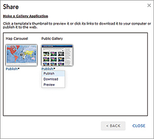 From the Share dialog box, click MAKE A GALLERY APPLICATION to make a group gallery into an app, then choose Publish from the drop-down under Public Gallery.