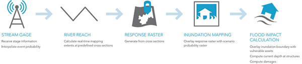 One of the most powerful aspects of FIMAN is its ability to not only measure and display gage information but also analyze, map, and communicate flood risks in real time. As gage readings are loaded into the central GIS database, they are first compared with predefined thresholds and the previous readings to assign a general flood condition (major flooding, minor flooding, no flooding) and determine the trend of the flood condition (e.g., increasing or decreasing). If a gage is identified as being in a flood condition, the database runs tools to develop estimated flood inundation boundaries and compute flood impacts.