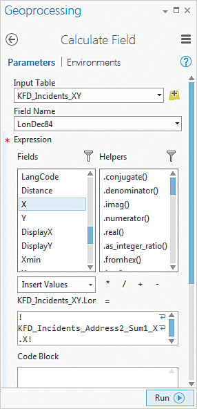 - In the Calculate Field wizard, confirm the Input Table is KFD_Incidents_XY table and LonDec84 is the Field Name. Scroll down through the Fields list and select X. Double-click X to preview the calculation formula. Leave all other areas with default values and click Run.