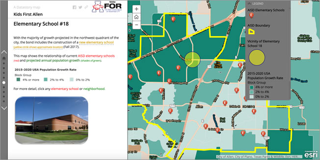 A community group used the Kids First Allen Story Map Journal as part of a campaign to spur passage of a $272 million school bond measure for Allen Independent School District (AISD) in the Dallas suburb of Allen, Texas.