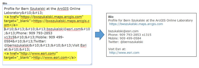 You can also add hyperlinks to your profile by using the <a> tag as you would in any HTML document. The example below is the same formatted profile shown above but with hyperlinks added (highlighted in yellow):