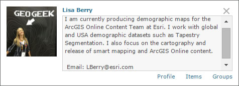 Your ArcGIS Online user profile is how your colleagues and peers in other organizations learn about you. Also, it’s a yardstick for measuring the value and veracity of your shared items and groups. Whether you’re making maps and apps for others in your GIS department, for users throughout your organization, or for the general public, it’s a good idea and a best practice to write and display a complete profile, especially if you want others to consider your content seriously.