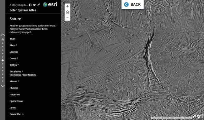 Artz: This whole project started somewhat by accident. While working on some story maps about Pluto and Mercury, a colleague mentioned that Trent Hare from the United States Geological Survey (USGS) had loaded a number of planetary basemaps on ArcGIS Online. I’m always looking for out-of-the-ordinary ideas for new Story Maps, and I thought it would be real easy to pull 10 to 15 of these maps into a Story Map and call it a “Solar System Atlas.” Then I looked at the NASA website and found a few additional maps, and then a few more, and then … next thing you know, I’ve gathered more than 60 maps from all over the solar system.