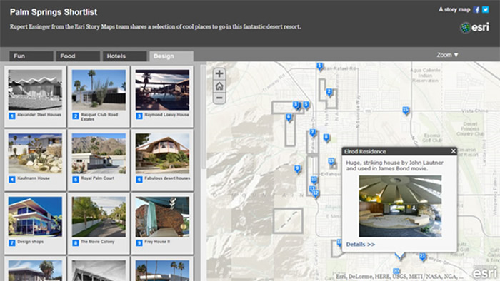Shortlist is the ideal template to use when you want to present a curated list of points of interest in a particular geographic area. A good example is the Palm Springs Shortlist, which features sections on fun, food, hotels, and design in Palm Springs, California.