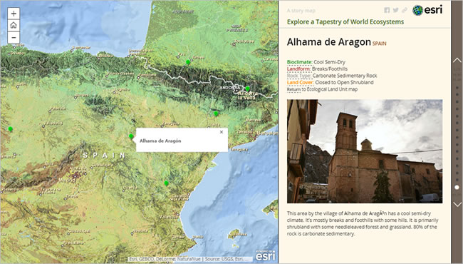 The Explore a Tapestry of World Ecosystems Story Map Journal lets you interact with the map and its data in the browser window and tour ecologically diverse locations by using the tour buttons.