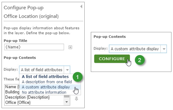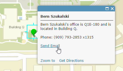 The map contains two layers: Office Location (original) and Office Location (configured). The original layer does not have a configured pop-up; it’s the default and unimproved display of attributes. Use this layer to follow along with the instructions below. The configured layer has a configured pop-up using all the email options described in this tip.