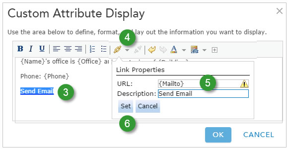 - In the URL text box, enter the field name containing the mailto string enclosed in the curly braces—in this case, the field name is {Mailto}.Note: You can add the Mailto field to your custom attribute display, then copy and paste it into the URL text box instead of typing. A warning will appear, but you can disregard it.