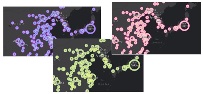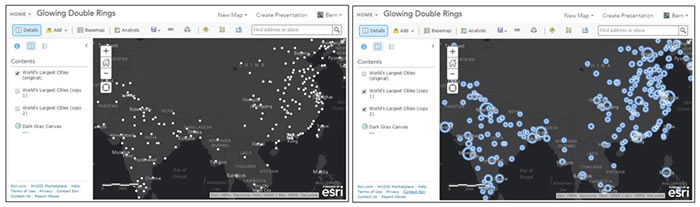 You can also overlap layers using different colors and transparencies to create a glowing double ring effect, as detailed in this tip. Use the provided sample map, or use your own map with layers having numeric values suitable for the Counts and Amounts (Size) drawing style. The sample map includes the original layer (left) plus the copied layers showing the result (right).