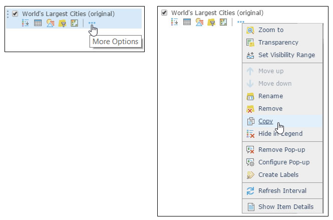 Step 1. Sign in to your ArcGIS Online account. Open the sample map (or your own map) and create two copies of the layer. Click Contents. To copy a layer, open the context menu then click More Options and choose Copy.