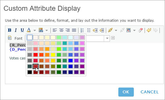 Step 3. Enter text and attributes in the Custom Attribute Display panel, and change colors as desired. In the example below, a presidential election results map from 2008 was configured with a custom attribute display, and results were displayed in different colors to indicate party affiliation.