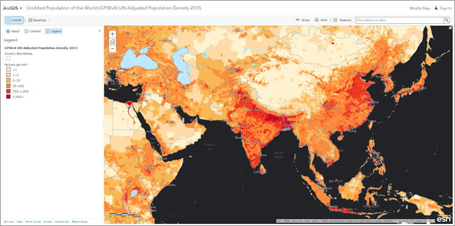 One dataset CIESIN has shared in the Living Atlas, UN-Adjusted Population Density 2015, is from the fourth version of CIESIN’s flagship data collection, Gridded Population of the World (GPWv4). The gridded format allows GPWv4 to be easily integrated with a wide range of data, supporting research, planning, and applications in vulnerability mapping, disaster impacts, and the health dimensions of environmental change.