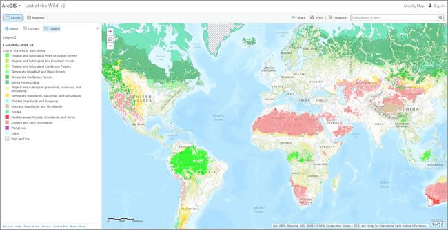 The story map also displays the Last of the Wild, v2 dataset. This map displays wild areas, or the areas of least human influence, within major terrestrial biomes based on the Human Footprint Index dataset, another dataset contributed by CIESIN. A biome is a region with distinct characteristics defined by climate and dominant vegetation, occupied by a community of plants and animals. The Last of the Wild dataset may be used to inform wildlife conservation planning, natural resource management, and research on interaction between humans and the environment. The dataset has been used to measure local extinction of native species, including assessing invasive plants in China and helping to predict how climate change can affect the spread of the Schistosoma mansoni parasite in eastern Africa.