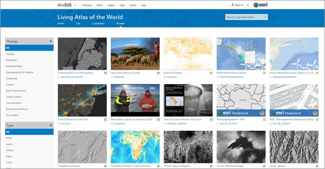 The Living Atlas contains thousands of valuable maps, data layers, tools, services, and apps that support geographic analysis and reporting. Organized by theme, the Living Atlas makes exploration and discovery efficient and simple. Its data is placed in a central location where users can access it and combine it with their own data for visualization and analysis.