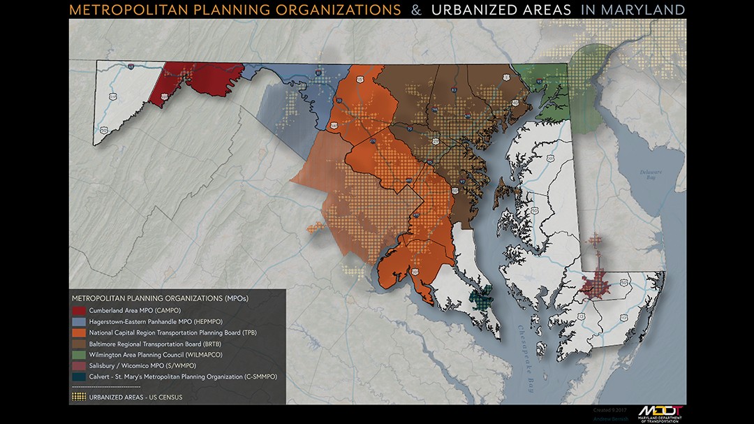 À l’aide d’ArcGIS et d’Adobe Creative Cloud, Andrew a aidé le MDOT à atteindre son objectif de générer des cartes esthétiques permettant de mieux interagir avec le public. Par exemple, Andrew a créé la carte Metropolitan Planning Organizations and Urbanized Areas in Maryland. Cette carte, utilisée dans plusieurs agences de l’État comme carte de présentation imprimée, détaille les informations géographiques des agences locales, de l’État et fédérales, en représentant les informations rapidement et avec de nombreux détails.