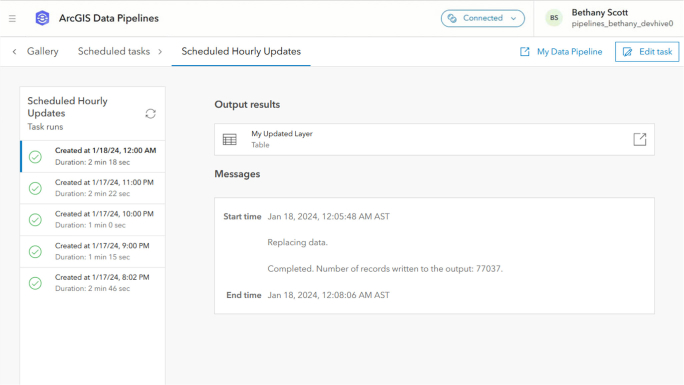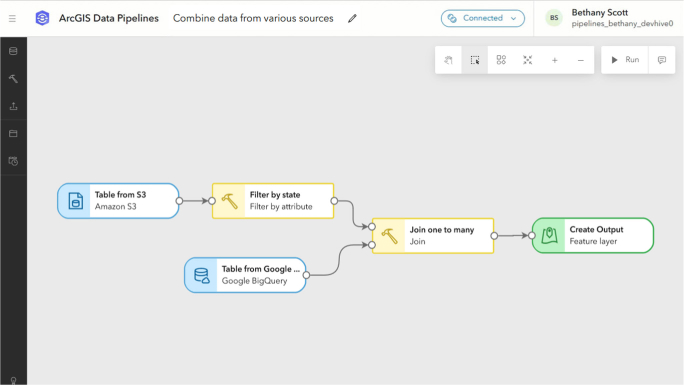ArcGIS Data Pipelines は、ArcGIS Online とのシームレスなデータ統合を提供し、多様なデータ ソースへの接続とベクター データやテーブル データの抽出を可能にします。 包括的なエンジニアリング ツールセットを使用することで、データの変換、クリーニング、結合、プレビューが簡単に行え、幅広いワークフローに利用できるほか、データの更新を自動化して正確度を保つこともできます。