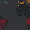コンピューター画面を見ながら机に座っている同僚と身を乗り出している同僚、およびピンク、紫、青の正方形を含む米国のマップの分割画面