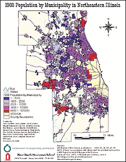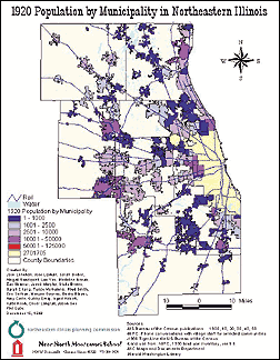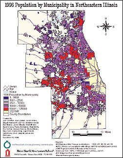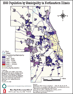 Teams with the Northeastern Illinois Planning CommissionClass Uncovers Historic Census InformationBy David Toan's Seventh and Eighth Grade Class, Near North Montessori School, Chicago, Illinois Students from Near North Montessori School in Chicago, Illinois, were asked to do a project with the Northeastern Illinois Planning Commission (NIPC), a regional government agency in Illinois. NIPC works with this school and other Chicago public schools on planning issues and also teaches students how to use ArcView GIS as a tool to do analysis. The purpose of the project was to help NIPC fill holes in early census population information for roughly 90 communities of the Chicago metropolitan area. NIPC uses this census data to interpret past trends and to make projections into the future. NIPC assigned the project to the students because they brought energy to it and, since it was the class focus, the students were very efficient. Middle school students from the Near North Montessori School teamed with their area planning commission to unearth historic census information and produce informative maps such as those shown below.