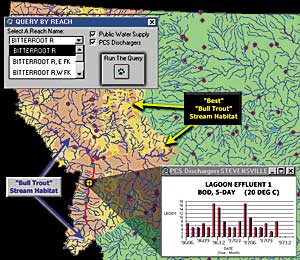 PermittingTypically, data used in issuing or reissuing National Pollution Discharge Elimination System (NPDES) permits is limited to facility-specific and select receiving water information such as a discharge monitoring report (DMR), designated use(s), and associated water quality standards. However, other pertinent data (e.g., permit violations, land application, endangered species, water rights) is often not considered because it is either inaccessible or unusable. The use of an effective data integration system can overcome this obstacle. Using GIS in permitting can notably increase program efficiency by reducing time spent on data collection and analysis and by increasing the quality of an agency's products (e.g., NPDES permits). For these reasons, watershed-based permitting is being considered by federal and state regulatory agencies as an avenue for improving the quality of NPDES permits and their protection of aquatic resources as well as increasing the efficiency of the permitting process. Achieving the complement of these goals relies on increasing access to and the usefulness of data for permitters. MontanaView Data and FunctionalityIn addition to its use as a permitting support tool, the Montana DEQ has been using GIS to develop a comprehensive list of water bodies in need of water quality restoration and to conduct a historical review of impaired waters. Water chemistry and physical and field parameter data are used in conjunction with habitat information and biological data to make water quality impairment determinations. At right: Map of Bull Trout habitat and facility discharge to the Bitterroot River. The system also provides access to land use information, allowing for the identification of potential pollution sources. MontanaView maps have facilitated the identification of correlations and interrelationships among data sets and information as well as among pollutants and their potential sources. "The maps are excellent overviews and allow concerned citizens to quickly see information within its proper spatial context instead of rummaging through numerous pages of analytical data," says Perri Phillips of the DEQ Monitoring Section. "These maps are also excellent visual aids during public meetings, whether the discussion is generalized on the large scale or specifically focused on a single water body determination." Montana's GIS also provides access to EPA's national water quality database, STORET, to identify water quality monitoring stations that meet user-defined requirements for selected parameters. In addition to historical water quality monitoring, the USGS tracks real-time stream flow and stage levels at monitoring stations throughout Montana. The data collected at these stations is available through the Internet. By clicking on a USGS stream flow location, the user can access data for any station for which USGS tracks real-time data. MontanaView automatically connects to the USGS Internet site for Montana (montana.usgs.gov) and pulls up stream flow data for the specific station of interest. MontanaView is PC-based, runs under Windows 95/98/NT, and links to distributed databases over the Internet. The system provides online access to U.S. EPA mainframe databases and U.S. Geological Survey real-time and historical stream flow data. The Natural Resource Information System (NRIS), maintained by the Montana State Library, was the primary source for the data layers in MontanaView. Water quality and stream flow data was obtained through the EPA and USGS, respectively. Additional Montana State agencies (e.g., Department of Fish, Wildlife and Parks) were contacted to obtain other applicable data to be included in the system. For more information, please contact William B. Samuels, Ph.D., senior scientist, Science Applications International Corporation, 1410 Spring Hill Road, McLean, Virginia 22102 (tel.: 703-288-6860, e-mail: William.B.Samuels@saic.com, Web: www.saic.com). |