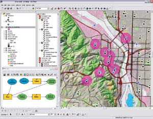 ArcGIS 9 is the next major release of ArcGIS. It builds on the strength of previous releases and adds important capabilities not previously offered in ArcGIS products. The focus of this release is on providing geoprocessing functionality, annotation and labeling improvements, geodatabase enhancements, 3D visualization, and new developer deployment options. Esri has made a significant effort in ensuring that existing ArcGIS applications continue to work unmodified at ArcGIS 9, making it easy for end users and developers to upgrade their systems. Esri is always committed to improving the reliability, scalability, and interoperability of the entire ArcGIS system, and ArcGIS 9 continues to make significant strides in these areas. New Geoprocessing FrameworkArcGIS 9 provides a complete geoprocessing framework and set of tools for the ArcGIS Desktop products: ArcView, ArcEditor, and ArcInfo. Along with mapping and data management, geoprocessing is one of the fundamental capabilities of GIS. Geoprocessing tools range from common GIS operations, such as overlay, buffer, and data management, to more advanced operations for raster processing and topology and schema definitions. The geoprocessing framework is common for ArcView, ArcEditor, and ArcInfo, though the number of tools available within each product varies. ArcInfo provides the most robust set of tools (approximately 200), including all of the geoprocessing functionality that has been available in ArcInfo Workstation, allowing for advanced analysis and the creation of complex work flows. ArcView and ArcEditor provide a subset of the more common map-based analysis tools (approximately 30). More than 200 additional tools are provided via the ArcGIS extensions such as ArcGIS 3D Analyst and ArcGIS Spatial Analyst. The geoprocessing tools in ArcGIS 9 can be used in a number of ways and work with all supported data formats including geodatabase feature classes. The same operations, commands, or tools can run within dialogs, interactively in visual models, or quickly via command line input or be integrated into multipart scripts or applications for advanced analysis. Refer to the table below to learn more about each method and when each can be used. Five methods for working within the geoprocessing framework