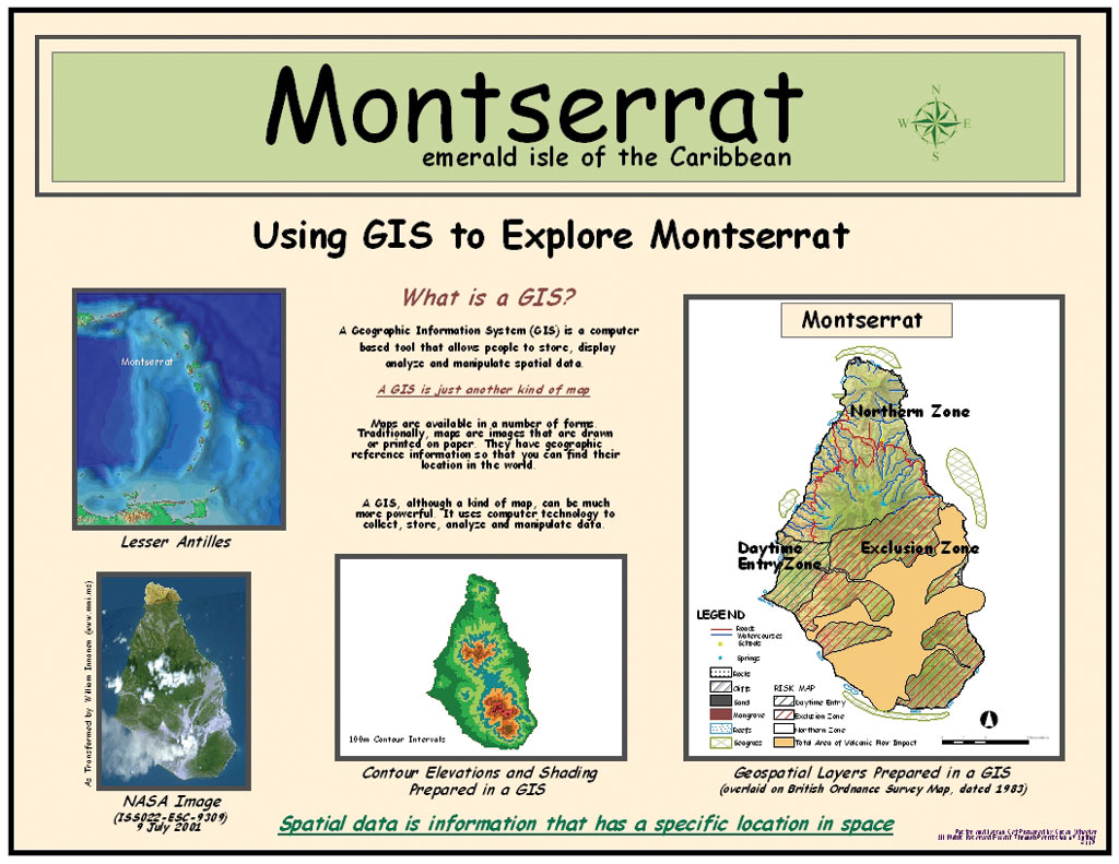Montserrat, a territory of the United Kingdom, is a volcanic island located in the Lesser Antilles, southwest of Antigua in the Caribbean. It is approximately 12 miles long by seven miles wide, approximately 39 square miles in land area, and located at latitude 16'45"N, longitude 62'10"W. Montserrat, known as the "emerald isle of the Caribbean," is a picturesque, rugged island characterized by mountain peaks and lush green tropical rain forests with a diverse and interesting flora and fauna. Its people are open, warm, and friendly. This tropical island paradise and the people living there have been affected by catastrophic volcanic eruptions since July 18, 1995. These eruptions destroyed the capital city of Plymouth and rendered the southern half of the island an exclusion zone. The population of the island has dropped from 12,000 residents before the eruptions began to the current population of approximately 4,000. Rebuilding efforts are underway in the northern safe zone, where the population now resides. Although volcanic activity has interrupted the lives of the residents, they continue to live in their changing world with poise and dignity. In December 2002, Susan Wheeler, a consultant in land development and GIS from Pennsylvania, went to Montserrat to introduce ArcVoyager software in the classroom at both the primary and secondary levels. ArcVoyager is a GIS teaching aid created by Esri's Schools and Libraries team to be used by elementary teachers, middle school students, high schoolers, librarians, college instructors, museum professionals, or parents. This project was developed in conjunction with the CALIPSO volcano monitoring project, sponsored by the National Science Foundation, the United Kingdom's Natural Environment Research Council, and the Montserrat Volcano Observatory. A set of six lessons was developed to teach basic geography and basic GIS skills. The lesson sets ranged from introducing GIS and its uses to exploring world and Montserrat data sets through ArcVoyager. Before traveling to Montserrat, Wheeler built georeferenced digital data sets of Montserrat in ArcView 3.x so the lessons would have real life value for the students. This was done by scanning the British Ordnance Survey (1983) tourist map, then warping and georeferencing it. Once this basemap was made, the boundary, road, and watercourse layers were produced. The purpose was to use this data set in ArcVoyager. Montserrat SchoolsThere are four schools in Montserrat. Three primary schoolsLookout Primary, Brades Primary, and St. Augustine'sinclude kindergarten through grade 6. There is also one secondary school known as Montserrat Secondary School. The educational system in Montserrat is based on the British educational system. Wheeler visited each school to install ArcVoyager software in the computer labs. At the primary grade level, lessons introduced GIS and explored the ArcVoyager software. The developed lesson set showed the Leeward Islands with the location of its volcanoes and the location of tectonic plates. The students were very excited to explore Montserrat in the context of the island arc and see how the volcanoes are related to tectonic plates. They were also very interested to learn that many volcanoes exist worldwide, and they were able to relate this information to their own environment and experiences. The primary students also followed a tutorial designed to introduce and explore the Montserrat data sets. The students learned how to add themes to a view; change the order of the themes; modify themes using the Legend Editor; and use various buttons on the toolbar such as Identify, Find, Query Builder, Zoom to Full Extent, Zoom to Selected, Zoom In, Zoom Out, and Pan. In the Montserrat Secondary School, a workshop was held for the geography teachers to explore ArcVoyager as a geography tool and to follow the developed lesson set. Their students were exploring the same lesson sets as the primary grade students, but have a greater ability to work online. The last lesson in the lesson set gives the students direction on how to access various free digital data set downloads from the Internet, explore tutorials from various educational Web sites, and build their own GIS projects. Kids Living With Eight Years of Volcanic ActivityThe 1983 British Ordnance Survey map, which was used to create the digital data sets, was produced before the volcanic activity began in 1995. The British Ordnance Survey is currently completing a mapping project to produce a new map for Montserrat, which should be available by the end of 2003. The first digital basemap Wheeler prepared for the students showed the island without any of the volcanic impacts. It became very apparent, when working with the students, that their knowledge base is predicated on their own life experience. There has been continual volcanic activity for eight years, and most of these young students only know the island as it exists with an active volcano. To make the lesson set relevant, Wheeler prepared additional lesson sets and sent them to the teachers to show the hazard zones, the areas of volcanic flow impact, and more detailed information about the northern safe zone. She modified the lesson set to give more complete data about the areas that are now inhabited and less data for the exclusion zone. While in Montserrat, Wheeler met with the local director of the British Ordnance Survey office and GIS professionals from the local Physical Planning Unit (PPU), which is part of the government of Montserrat. The purpose of this visit was to collect existing cadastral mapping data of a newly developed neighborhood and use it as part of the lesson set for the students. Jo-Ann Burke of the Lands and Survey Department and Jerome Meade of the Physical Planning Unit shared their data about the new neighborhood. This made it possible to add an additional lesson that shows a specific, newly developed neighborhood. The production of the base set of maps w