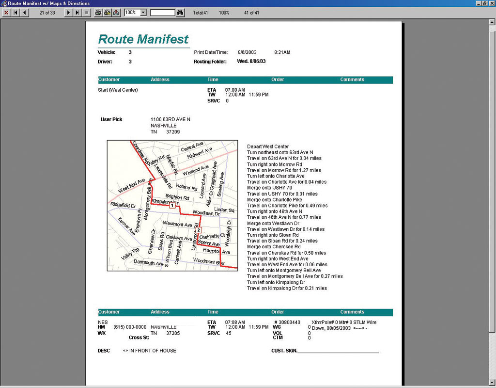 On June 30, 2003, the American Red Cross eliminated its transportation services in San Diego, California, and the San Diego Regional Center (SDRC) was suddenly without buses for half of its clients. "It was a nightmare," says Bernard Arroyo, transportation coordinator, SDRC. "Fifty percent of our capacity was eliminated, and I was very concerned about finding a solution for this problem." SDRC is one of 21 regional centers in California for persons with developmental disabilities. Since its creation in 1969, SDRC has been serving people living within the geographic boundaries of San Diego and Imperial Counties. The center serves as a focal point within the community for those with developmental disabilities and their familiesa venue for these individuals to receive, or be referred to, health, welfare, and education resources. "We had to make do with the limited resources in the community," adds Arroyo, "I knew I would not be able to find one contractor to replace the 47 bus routes the Red Cross operated, but I also thought there was some operational efficiency to be gained if we reevaluated the system." Of the 15,000 people aided by SDRC, 1,000 use the center's private transportation service. The service is contracted out among nine different transportation companies, some of which operate in a different geographic area and may have a particular specialty such as transporting both the medically frail and ambulatory clients. "Our agency has a contract with the state of California to provide these services," says Arroyo, "and although the state doesn't tell us how we should operate, it does expect that we meet the needs of the clients and operate in a cost-effective manner. The center creates the supplementary transportation, or paratransit, routes to avoid overlap by different contractors at the same pickup locations and to better ensure that our consumers are receiving access to programs within their community. We want to keep transit times to a minimum, and we work with many nonprofit companies and smaller companies that just don't provide enough transportation service to warrant the purchase of their own routing software." Prior to July 2002, the center used grid coordinates from a popular series of mapbooks to track the location of each pickup and drop-off point. However, those maps were structured in such a way that one location may have two different coordinates as pages overlap. As the need for a more effective routing strategy became apparent, the center received a grant from the California Department of Transportation (Caltrans) and implemented Esri's ArcLogistics Route (customized for the paratransit industry by Infinite Enterprises), ArcView, and the ArcView Network Analyst extension. However, it was during this initial implementation process that the Red Cross eliminated its transportation services. "When the Red Cross gave notice, we used the software to create the new routes that we were going to need," says Arroyo. "We discovered that if we created the new routes, we could then take that information to the contractor and it could acquire the buses that we would need. We increased our productivity by at least 20 percent. Before implementing our new system, we were operating at 4.4 trips per hour, and now we are operating at 5.8 trips per hour. "ArcLogistics Route helped get us out of that predicament of suddenly reduced transportation services. And it worked wonderfully. First, we were able to get a much clearer understanding of how our system was operating. Second, we were able to effectively use the limited resources that were available in the community. In that respect, even if we don't use the software again, it's been well worth the money the agency paid. But now we have to look at how to take this to the next levelgetting our entire SDRC logistical system into the software." For more information, contact Bernard Arroyo, SDRC (e-mail: barroyo@sdrc.org, tel.: 858-576-2969). Maintenance Routing at Nashville Electric ServiceOne of the largest public utilities in the country, Nashville Electric Service (NES) distributes energy to more than 329,000 customers in middle Tennessee. The NES service area covers 700 square mileswhich includes all of Davidson County and portions of the six surrounding counties. Responsible for 104,700 streetlights and private lights, NES receives 75 to 100 calls for maintenance per day.