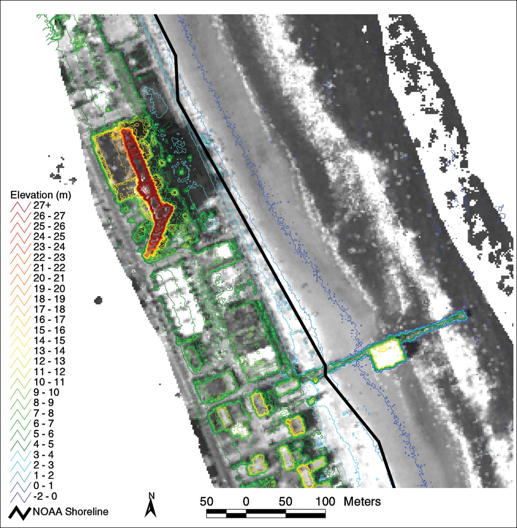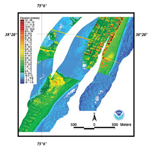 In the United States, monitoring the coastal zone, as it is commonly known, is the responsibility of the National Oceanic and Atmospheric Administration (NOAA), which was established in 1970. Early predecessors of NOAA include the United States Coast Survey, which was established in 1807 by Thomas Jefferson. In 1878, that agency's name was changed to the Coast and Geodetic Survey to reflect the growing role of geodesy in its work. Fundamental to managing a coastline is first determining its location. This may seem obvious, but Cindy Fowler, information technology specialist at NOAA's Coastal Services Center, says, "Determining the location of a shoreline is one of our agency's biggest challenges as well as being one of our most important responsibilities. The shoreline is a critical boundary for property owners. It determines whether a particular piece of property can be developed or not because its proximity to a proposed structure can predict that structure's possible risk from floods and storms. The shoreline also establishes the international boundary off the coast of a nation and determines the extent of that country's legal jurisdiction." The shoreline is established by determining the mean high-water mark. With more than 95,000 miles of ocean and Great Lakes coastline, NOAA's coastal management responsibility is extensive. Light Detection and Ranging (LIDAR) is a remote sensing system used to collect topographic data. It is particularly useful in shoreline mapping because it is faster and less costly than traditional beach surveying methods. To make its measurements, a LIDAR sensor pulses a narrow, high-frequency laser beam toward the earth through an opening in the bottom of an aircraft. The sensor records the time difference between the emission of the laser beam and the return of the reflected laser signal to the aircraft. LIDAR data can be viewed in a GIS as a point, grid, or contour data set. Elevation data is best viewed in a grid format, which divides the area mapped into cells and assigns each cell a value based on the surrounding elevation points. The grid data set provides a smooth, continuous surface when displayed and allows the best opportunity for analysis, facilitating the management, analysis, and display of georeferenced data. NOAA has developed an extension to ArcView Spatial Analyst called the LIDAR Data Handler. It provides a number of options for the display and manipulation of gridded LIDAR data sets.