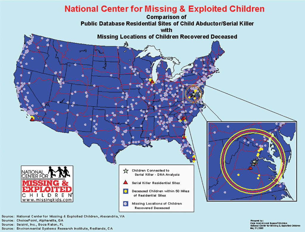 A 2002 national study released by the U.S. Department of Justice's Office of Juvenile Justice and Delinquency Prevention (OJJDP) estimated approximately 204,000 family abductions took place in 1999. Forty-four percent of these involved the concealment of the child. In 76 percent, it was the intent of the abductor to prevent contact with the other parent; in 82 percent, the abductor intended to permanently alter custody. The study also estimated 1,682,900 episodes of runaway/thrownaway children took place that year. Fewer cases, but more ruthless and violent, involve those children taken by strangers who are sexually molested and killed and those children who go missing without a trace. With the enactment of the Missing Children's Assistance Act (MCAA) in 1984, Congress directed the U.S. Department of Justice's OJJDP to establish a private organization to act as a national clearinghouse of information on missing and exploited children. The National Center for Missing & Exploited Children (NCMEC) (www.missingkids.com), a nonprofit organization, was established in April 1984. Impressive Recovery RateEvery day, 24 hours a day, NCMEC receives calls for assistance in searching for missing or abducted children from law enforcement and searching parents through its national, toll-free hot line (1-800-THE-LOST) in the United States, Canada, and Mexico. Since NCMEC was established, it has had an impressive recovery record. Through December 31, 2002, NCMEC has assisted with recoveries of more than 94 percent of the cases involving missing and exploited children and handled nearly 1.7 million telephone calls through the hot line. NCMEC now receives an average of 700 calls per day, of which more than one-third require the MCAA-mandated services. When a child is reported missing to NCMEC, the child is assigned to one of four main missing case typesendangered runaway (ERU); family abduction (FA); lost, injured, or otherwise missing (LIM); and nonfamily abduction (NFA). Currently, ERUs represent approximately 72 percent of the children reported missing to NCMEC; FAs, 22 percent; LIMs, 4 percent; and NFAs, the remaining 3 percent. To draw attention to the plight of missing children, a variety of tools disseminate the information about the child and/or abductor. After reports concerning missing children are "intaked" by the NCMEC hot line and its protocol requirements are met, a case manager in the Missing Children's Division (MCD) is assigned and provides technical assistance to the searching parent(s) and to the law enforcement agency investigating the case. Local law enforcement agencies, the Federal Bureau of Investigation, other nonprofit organizations, and parents might also receive leads. Staff analysts in the NCMEC Case Analysis and Support Division (CASD) work with the case managers to rank these leads for their investigative value. All leads received are disseminated to law enforcement. Geography and Missing KidsIn 2000, hoping for support for the program, NCMEC contacted Esri, which provided software to help find missing children. When a child is reported missing as either ERU or a victim of FA, the custodial parent(s) provides NCMEC with information about possible locations where the child might be. For ERUs this might be the location where friends reside or an area that the child discussed wanting to go. For FAs this might include the abducting parent's present address, former address, or addresses of the abducting parent's relatives and friends.
