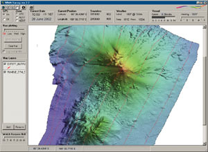 Tangaroa uses a Simrad EM 300 multibeam echo sounder to produce the equivalent of an aerial photograph of the seafloor. The EM 300 is mounted on the ship's hull and works by transmitting (pinging) "beams" of sound to the seafloor and measuring the time it takes for the signals to return. This time is directly related to water depth. With 135 beams fanning out across the seabed for each ping, up to 4.5 km of seabed can be mapped in a single pass. Once the multibeam data has been "cleaned" to remove marks made by shoals of fish and the like, the multibeam operator onboard Tangaroa uses a special menu designed by NIWA using ARC Macro Language (AML), which means that no experience in ArcInfo Workstation is needed to produce the GIS images. The operator simply starts ArcInfo and types a command to launch the menu. The operator can browse directories, choose a file to process, adjust the settings, and then click "run" to produce whatever view is required. The team had planned to map all depth ranges over an entire survey area before collecting samples, but the voyage encountered two storms. The team spent seven and one-half days attempting to take shelter from winds gusting up to 95 knots and swells approaching 12 meters. With time, money, and safety at stake, the scientists opted to map a single depth range, take samples immediately, and then do more mapping. As soon as each survey line was completed, the multibeam data was processed and maps of the survey area were produced within minutes, thereby minimizing vessel downtime before sampling operations could begin. When mapping the seafloor with a multibeam echo sounder, the strength (or amplitude) of the returned signal depends on the nature of the seabed. Thus it is possible to assess what the substrate is made of (mud, sand, gravel, bedrock, or a mixture of these) and how rough or lumpy the seafloor is. A standard template was created in ArcGIS to produce charts of any area of interest so the scientists could accurately plan the deployment of sampling gear in the right depth and in a suitable seabed type. The ArcGIS Spatial Analyst extension allows scientists to analyze the slope and aspect of the seabed to aid their decision making. ArcGIS 3D Analyst with ArcScene was used to help scientists visualize the topography and inspect the study area at any angle, from any direction, and with varying vertical exaggerations. NIWA software developers also wrote an application called NIWA Survey that provides a real-time view of the vessel's position. This application incorporates georeferenced TIFF images and shapefiles generated from the multibeam processing and overlays the position of the vessel as a tracking layer. The scientists were able to monitor Tangaroa's position from any of the laboratories onboard, giving the sampling equipment the best chance of reaching its desired target. The benefits of using ArcGIS Desktop in planning biodiversity sampling in the Antarctic were many. It reduces the number of misdrops and aborted gear deployments and hence increased the amount of sampling that can be done within the survey period, as well as limits environmental damage. Despite the storms, the survey achieved its main objectives. NIWA and its international collaborators now face several years of work to fully define the diversity of fish and invertebrates found on the survey. For more information, contact Kevin Mackay, NIWA ocean geology (tel.: 64-4-386-0479, e-mail: k.mackay@niwa.co.nz), or visit www.rosssea2004.govt.nz and www.niwa.co.nz. |