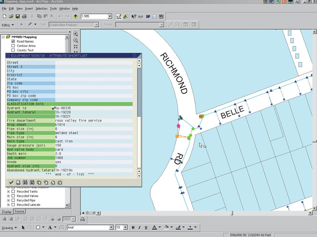 Gavin McGhie, MMWD's GIS coordinator, says, "The combination of these two systems has created an extremely powerful tool that provides users access to SAP information via a user-friendly map-based interface. Strengths of SAP are that it controls business processes and rules and maintains data integrity and relationships. Thus, GIS efforts are focused on the spatial aspect of the data. GIS allows users to browse a familiar-looking map; point to a feature; and, with the click of a button, obtain information about that feature from SAP." McGhie explains, "Having ArcInfo integrated with SAP gives the staff access to a wide variety of information that previously required it to hunt and gather information from various locations within the MMWD offices. It is a definite time-saver." The GIS interface to SAP is especially useful to workers needing field information. Because the majority of the SAP work flow is related to location, workers can easily access SAP through intuitive GIS tools. Workers simply point to features on the map and GIS interfaces with SAP to quickly locate a diverse set of assets. With GIS, users can view relevant SAP asset data within a single window, thus making projects more manageable. Interface ApplicationsMMWD GIS personnel created several timesaving applications by using the interface between GIS and SAP. For example, the engineering department can use a UNIX workstation GIS function to add an existing pipe, valve, or meter and then access SAP to add attribute information. Through ArcGIS access, users have an inquiry option, which simplifies gathering information, such as a pipe's length and diameter or the types of material used for certain kinds of equipment. A Pipe Location Packet (PLP) application allows a user to select a set of service meters and/or fire lines in GIS and click a single button to prepare a PLP file for SAP. The user is then directed to open SAP and run a custom transaction that retrieves the file and creates a PLP based on the selected file's contents. This process previously took several hours or more, depending on the number of affected services. The application reduces the process to minutes.