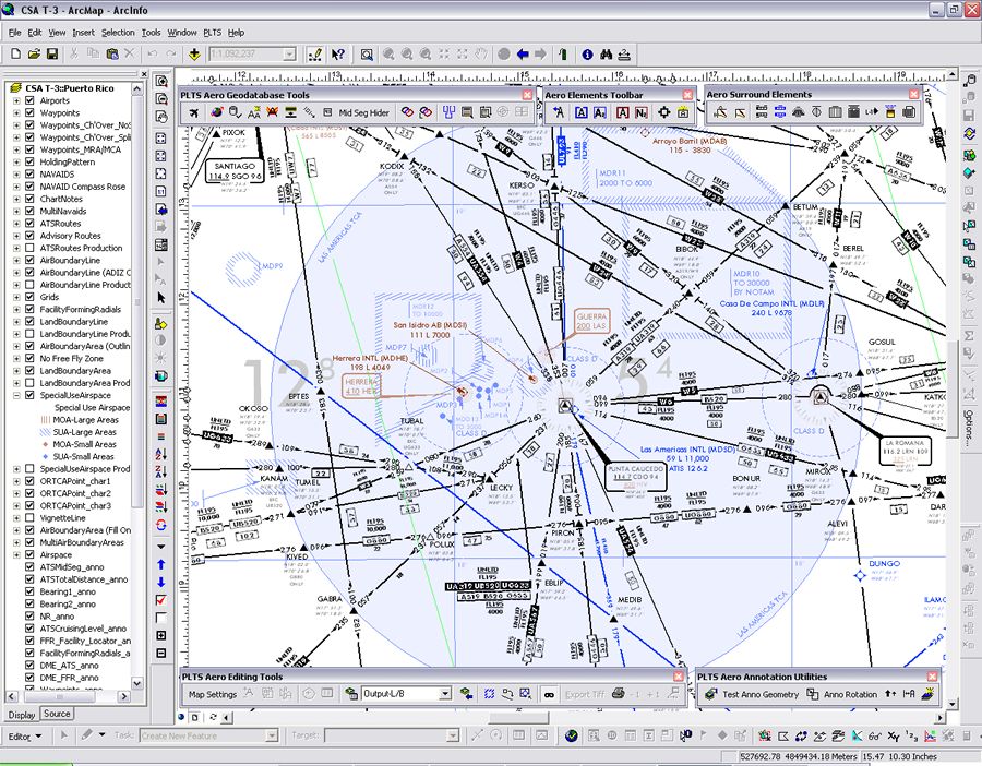 Aeronautical charts can be complex to produce and maintain when using manual cartography or CAD-based systems. The charts are filled with intricate text and advanced symbols that must be updated as the information content of the chart changes. PLTS for ArcGISAeronautical Solution addresses the complexity of producing and maintaining aeronautical charts through database driven cartography on the ArcGIS 9 platform. Because the charts are database driven and changed information is only entered once into a central database, the possibility of error propagation is eliminated. This approach leverages the geodatabase model built into the Aeronautical Solution, allows all updates performed at the feature level to be automatically reflected on features of associated charts, and allows updates of the feature-linked annotation contained within the charts. With feature-linked annotation, cartographers need only visit changes to confirm automated software placement of related text. The work flow incorporated by Esri includes the use of GIS Data ReViewer, a PLTS component that zooms to changed locations for quick quality control (QC) and verification tracking. This automated update work flow translates into less manual work for cartographers, while maintaining a high level of QC and efficiency. This initial release of Aeronautical Solution provides a work flow for producing National Geospatial-Intelligence Agency-style Enroute and Area Arrival charts. The tools can also be configured to meet other Enroute Flight Rules specifications. PLTS for ArcGISNautical Solution
