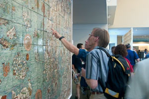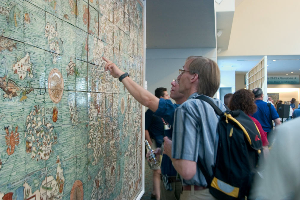A glimpse into the past was presented to attendees at this year's Esri International User Conference. Large murals of hand-painted Talavera tiles illustrated some of the most stunning maps from centuries past. The exhibit was a joint effort of Carlos Salm�n Gonzalez, chief executive officer of Sistemas de Informaci�n Geogr�fica, S.A. (SIGSA) and SIGSA's Talavera Tile workshop, Talavera de la Luz. The mesmerizing pieces allowed onlookers to experience a bit of cartographic history. Hundreds of vividly colored Mexican Talavera tiles formed the towering murals replicating many ancient maps. Talavera tiles, a special ceramic tile made only in Puebla, Mexico, are descendants of ceramic tiles that date back to the earliest civilizations. During the 16th century, Spanish monks from a monastery in Puebla, Mexico, sent for craftsmen from Talavera de la Reina, Spain, to teach the indigenous people in the region how to work with clay to decorate Spanish monasteries and churches with tiles. However, these people were already accomplished potters and had a long tradition of producing quality earthenware. This allowed them to easily learn how to use a potter's wheel and tin glazes, the main characteristics of Talavera tiles. Today, all Talavera workshops must follow strict guidelines, including only using clay from the Talavera zone in Puebla, Mexico; hand painting all pieces with six traditional mineral pigments; and other rules that give the tiles their unique and stunning appearance. Salm�n first decided to create map murals using Talavera tiles seven years ago when SIGSA acquired the Talavera de la Luz workshop. "One day I was in Puebla, Mexico," says Salm�n, "and I found a nice map of Puebla in an antique shop, so I decided to make the map in Talavera tiles and donate it to the city of Puebla." After Salm�n created the first map, which is on display in one of the city's plazas, he realized that many maps made on perishable materials from long ago have been destroyed and might still exist if they had been created in Talavera tiles. This thought enticed him to start and build a collection of maps that represent important aspects of the history of cartography. "I do a lot of research about the story of cartography, and I look for maps that have cartographic importance as well as aesthetic value," he says. "We try to combine the importance of the maps with their beauty." As the collection of Talavera tile maps grows, so do Salm�n's travels. He obtains copies of the maps he would like to use from around the world; from Turkey, China, and France, he seeks maps that will complete the collection. "It has taken us years to get good copies of some of the maps in order to reproduce them," he explains. "For instance, the original Catalan Atlas is in Paris and we couldn't find a copy with enough resolution, but we finally found it after years of looking." The murals on display at the 2004 Esri International User Conference were a small sample of the collection. Talavera de la Luz is a small workshop, with only 15 people, so each map usually takes three to five months to create. The complete collection, which will contain maps from 6,000 years ago to recent maps, should be complete in six to 10 years. Once complete, Salm�n's goal is to give the collection to the people of Mexico, either in a museum or as displays in various cities.