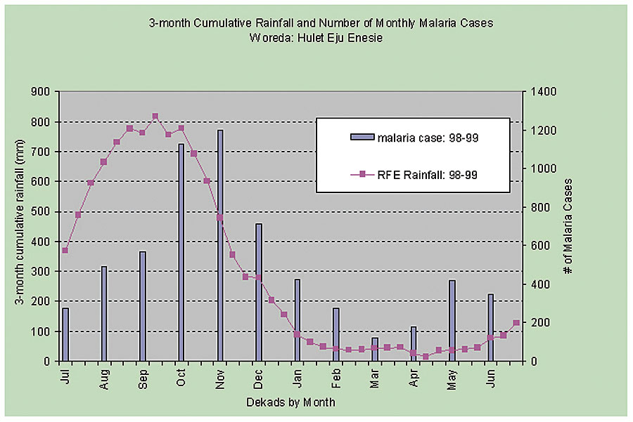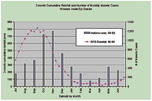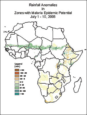 Penalties for removing trees within the reserve include both incarceration and fines ranging from $400 (U.S.) to $2,000 (U.S.), as stipulated by national laws. In addition, the value of the felled trees is calculated and added to the court fines. Concludes Ambe, "Since our maps of the reserve are completely georeferenced, the individual farms within the reserve are all coded and the trees within the farms documented, providing us with very good information regarding the trees within the cultivated land that are the responsibility of the farmers to protect. If we discover a felled tree, we simply take its GPS point and can easily determine whether or not the tree is within the reserve, and if so, we can bring the culprit to justice." For more information, contact Ngwa Christopher Ambe, Limbe Botanic Garden- Cameroon (e-mail: ambelem2004@yahoo.co.uk). Modeling Potential Malaria Hotspots in EthiopiaNearly a million deaths occur annually in sub-Saharan Africa as a result of malaria. It kills an African child every 30 seconds, and those who are fortunate enough to survive a severe episode of the disease may suffer lasting learning impairments or brain damage. In Ethiopia, more than 65 percent of the country's 70 million people are exposed to malaria, and more than five million cases of the disease are diagnosed each year. Ethiopia's Ministry of Health summarizes the impact of malaria on the country, "The socioeconomic burden resulting from malaria is immense. The high morbidity and mortality rate in the adult population significantly reduces production activities. The prevalence of malaria in many productive parts of the country prevents the movement and settlement of people in resource-rich low-lying river valleys, while the concentration of population in nonmalaria risk highland areas has resulted in a massive environmental and ecological degradation and loss of productivity that exposes a large population to repeated droughts, famine, and overall abject poverty. The increased school absenteeism during malaria epidemics significantly reduces the education of students. In addition, coping with malaria epidemics overwhelms the capacity of health services in Ethiopia and, thus, substantially increases public health expenditures." According to Gabriel Senay, a senior scientist at the National Center for Earth Resources Observation and Science (EROS), "Malaria in Ethiopia is not only a health issue, it is also a food security and environmental issue." To help counter this scourge, a Malaria Early Warning System is being developed for deployment throughout Africa. Several studies have been made to connect malaria epidemics and weather variables. Rainfall, temperature, humidity, and soil moisture are factors known to affect the transmission rate of malaria. Efforts to predict malaria epidemics focus on the role weather anomalies can play in epidemic prediction. In addition to weather monitoring and seasonal climate forecasts, epidemiological, social, and environmental factors can play a role in predicting the timing and severity of malaria epidemics. Basically, certain conditions can produce a surge in numbers of both the parasite that causes the disease and the host mosquito that spreads it. The data related to the various factors that lead to the increase of both the malaria parasite and mosquito can be incorporated into a GIS to develop predictive models for malaria epidemic forecasting. EROS uses satellite imagery in conjunction with ArcGIS Desktop software ArcView and ArcInfo to develop such models. The data is analyzed and overlaid on a topographical map to determine the likely time and location of pending malaria outbreaks. "What we have determined," comments Senay, "is that the presence of a lag time between peak malaria transmission and seasonal rainfall events is very important for forecasting malaria outbreaks using observed weather data. Once the main rainy season declines in intensity and frequency in September, the increasing average daily temperature and progressive dryness beginning in mid-September create a conducive environment for mosquito breeding in areas where water has been accumulating from the main rainy season. The lag time between the end of the main rainy season and peak malaria transmission can be explained by the inherent lag time in mosquito breeding and parasite life cycle inside the mosquito, which are dependent on air temperature and humidity." By highlighting potential malaria hotspots identified with GIS-based predictive modeling, affected communities can be mobilized to perform preventive or mitigating activities to help minimize the severity of the pending outbreak. For more information, contact Gabriel Senay, senior scientist, USGS, EROS (e-mail: senay@usgs.gov, tel.: 605-594-2758). |