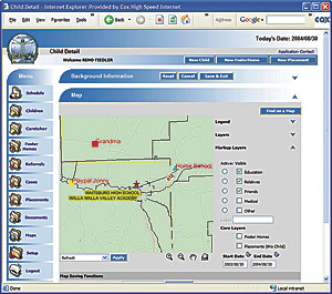 Washington Governor Christine Gregorian comments: "Each day, foster parents, social workers, police officers, and others strive to do one of the most complex and emotional jobs imaginablereclaiming young lives too often given up as lost and providing hope to those lives where so little hope seems to exist." Last year the Washington Department of Social and Human Services (DSHS) settled a multimillion-dollar class action lawsuit filed on behalf of children in the state's foster care system. The suit was filed six years ago on behalf of Jessica Braam and approximately 3,500 other foster children who had been moved three or more times while in foster care. More than one-third of those children were placed in more than eight homes. The settlement agreement required DSHS to make major changes in its system of placing and caring for children in its custody. Brainstorming an Innovative ApproachThe idea for an innovative approach to this daunting problem arose when DSHS workers brainstormed with Esri and Scientific Technologies Corporation (STC), an Esri Business Partner, at the 2004 Washington State Health Conference. It was agreed that STC, a public health informatics company with nearly 20 years of experience, and Esri would collaborate to create a viable solution. As a result, DSHS authorized a Children's Administration-GIS Pilot Project. DSHS contracted with STC and Esri to create a more robust case management system with integrated GIS. State officials are currently considering replacing the existing system based on the pilot project's success. According to Pat Brown, program manager for DSHS, "We saw in the pilot application how data mapping would allow our field staff to visualize the relationships among referrals, biological homes, foster homes, schools, and health providers, to name a few, in ways that would dramatically improve the safety, permanency, and well-being of children in out-of-home care." STC performed an in-depth needs assessment and interviewed social workers before developing the software. Because GIS was one of the focuses of the project, interviewers discovered which spatial issues were most relevant to placement decisions. The first and most basic task was to integrate all of the aggregate data into one place, which was supported by an Oracle database. This allowed social workers access to all of the available information in a more expeditious manner and provided them with a Web-based interface supported by a central data repository. Better Visual Tools