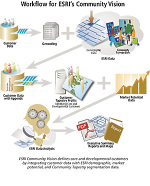 Knowing who their best customers are, what they buy, how to reach them, and where to find more customers like them is critical to the growth of all companies. Businesses that can answer these questions about their customers are much more likely to succeed than those that cannot. The more a company knows about its customers, the better it can serve them, keep them, and find more like them. Esri's Community Vision projects are ideal solutions for companies that do not have in-house resources to perform valuable customer analyses, such as where the best store locations are or how to increase exposure to the right audience. Community Vision projects are designed and managed by Esri experts to help identify a company's core and developmental customers, as well as customer lifestyle and spending habits. Community Vision projects are delivered as a suite of interrelated reports, maps, and demographic analyses in hard-copy and/or PDF files. A company's customer records are the foundation of each Community Vision project, along with Esri's segmentation system, Community Tapestry. (Community Tapestry is described in more detail in What Is Community Tapestry?) Segmentation operates on the theory that people with similar tastes, lifestyles, and behaviors seek others with the same tastes"like seeks like." These behaviors are measurable and predictable and can be targeted.
