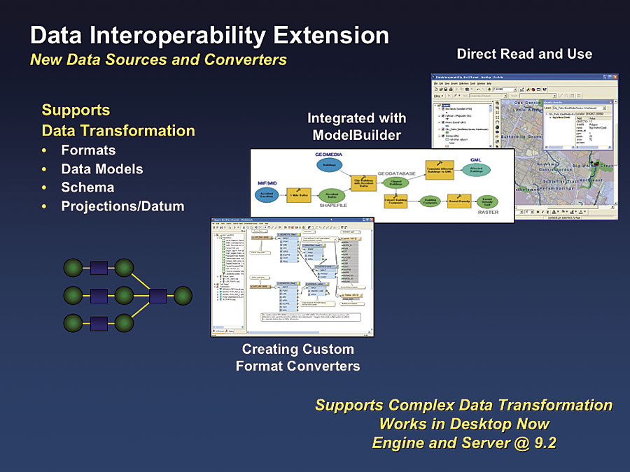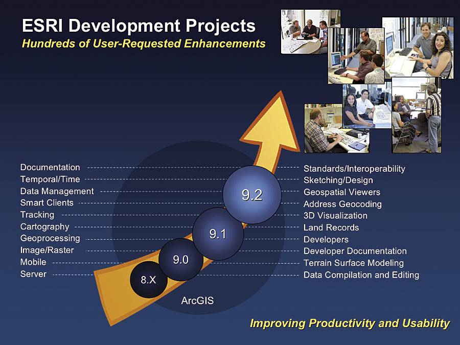 These individual strategies are being realized in an integrated network architecture that leverages the multiple ways our users deploy our tools (e.g., mobile, desktop, client/server, and networks). ArcGIS 9.2Responding to Users' RequestsThe current Esri development focus is on the ArcGIS 9.2 release, which is targeted to be available in the first half of 2006. This release is large and responds to literally hundreds of user requests for additional functionality. This release also focuses on making major improvements in user documentation, quality, and the usability of our software. ArcGIS DesktopThere are major enhancements in all four ArcGIS Desktop products (ArcReader, ArcView, ArcEditor, and ArcInfo) and their extensions. Improvements include areas such as data compilation, geoprocessing, data management, interoperability, cartography, charting, and animation. Data Compilation and EditingData compilation/editing will be enhanced to include a full suite of COGO construction tools for supporting land records data entry inside ArcEditor and ArcInfo. There will also be many improvements in CAD integration, including better annotation support, native rendering, and improved tools for georeferencing. There will be improved raster-to-vector conversion tools for better feature recognition and extraction. In addition, ArcGIS Survey Analyst will implement a complete workflow for cadastral data management. InteroperabilityArcGIS 9.2 will extend and improve support for standards-based interoperability and will also add new data sources to the ArcGIS Data Interoperability extension, providing new direct read/conversion capabilities. This extension will support "transformations" of complex data from one set to anothernot just the data format conversion but also the underlying schema reorganization necessary for semantics translation. This Extract, Transform, and Load type of interoperability procedure is particularly important for interoperability between and among systems on the Internet. Examples of large users in the United States already doing this include the Bureau of Land Management, Department of Homeland Security, and the U.S. Geological Survey. In addition, hundreds of local governments, such as Sacramento County, California, and Salt Lake City, Utah, are using this extension to dynamically support their data transformation remapping for all types of datasets. CartographyArcGIS 9.2 will offer many new advancements in cartography, particularly for creating high-quality maps. Perhaps the largest of these is in the area of cartographic editing and finishing (i.e., being able to edit and persist map symbology in a geodatabase). The editing capability is similar to that supported with graphics packages often used for cartographic finishing. This means cartographers can use advanced rules-based technology for automatic, computer-generated mapping and interactive graphic tools to apply an artistic touch to the design and finishing of maps. ArcGIS 9.2 will support the ability to store multiple graphic representations for a single feature in a geodatabase. This means that a single set of features can be used to support multiple types of map products at different scales, while at the same time maintaining a single set of features for "one-touch" editing. ArcGIS 9.2 will also have a series of cartographic generalization tools that performs a variety of geometric operations of GIS features, including line simplification, aggregation of polygons, and simplifying buildings. Design SketchingThis year, ArcGIS will introduce a new sketching tool for geographic information. This tool will support many fields of geographic design, such as landscape architecture, city and regional planning, forestry, military planning, and other types of strategic designs in which sketch visualization is important. The idea is that a user can create one or more design sketches using a drawing tool that displays fully rendered geographic features. As the user is sketching, the software stores these features in a geodatabase. This means a user can see the features in symbolized form as they are being sketched and immediately perform GIS analysis of these features using the full set of GIS analysis and modeling tools. For example, a planner can create a design and immediately understand the impacts of this plan on various factors (e.g., flooding, pipe pressure, and the environment). This tool will be available for download from the Web site for use with ArcGIS 9.1 and ArcGIS 9.2. Continued on page 2 |