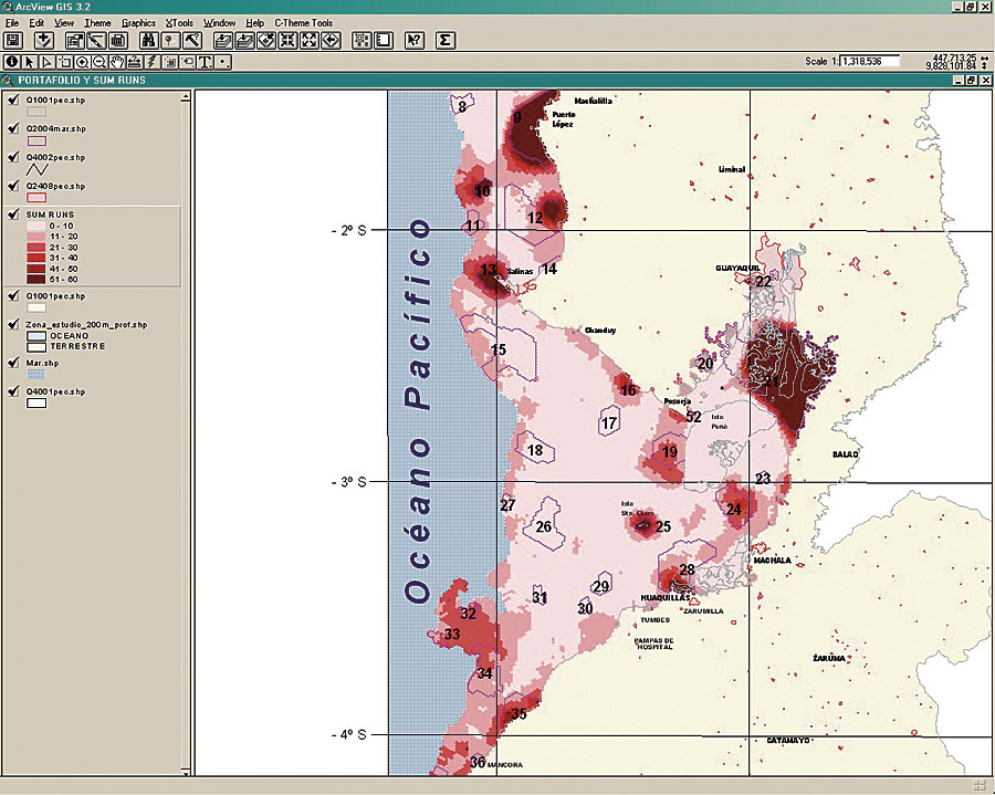 For the merging of separately designed databases, attribute tables were compared and adjusted to ensure that the database structures corresponded and the same coordinate system was being used. To prepare the vegetation and land-use data, information was gathered from satellite imagery taken in 1998, 1999, and 2000 and from several previous land-use studies for both Ecuador and Peru. Previous studies included nationwide products (such as the Vegetation Map of Peru prepared by Peru's National Institute for Natural Resources), as well as maps prepared for specific agricultural or conservation projects (such as the Mache-Chindul Reserve Management Plan Update prepared by CDC-Ecuador, Conservation International, and Ecopar). These secondary sources were helpful in providing missing information about areas obstructed by clouds in the principal satellite images. Rectification was achieved by establishing between 25 and 50 control points, depending on the topographic characteristics of each zone. ERDAS IMAGINE 8.4 was used to determine the coordinates of the control points and provided mathematical models and nearest neighbor methods for rectification of a majority of the images. A combination of methods using ArcGIS Desktop and IMAGINE were used to interpret vegetation types from the satellite images, including calculation of vegetation indices and semiautomatic image classification. Direct visual interpretation and consultation with area specialists were used to resolve interpretation of questionable areas. A low pass filter was applied to the images to simplify the classifications. Finally, ArcGIS Desktop was used to convert the images from raster to vector format, and standard cartographic elements were added to create the final Equatorial Pacific Ecoregion map. Optimization Algorithm with an ArcView InterfaceParticipants made use of an ArcView application called Sites 1.0 that facilitated the design of a portfolio that would most efficiently represent all of the species and ecosystems found in the ecoregion. Sites 1.0 was developed for TNC by researchers from the University of Queensland, Australia, and University of California, Santa Barbara, using heuristic algorithms for representative site selection exercises (www.biogeog.ucsb.edu/projects/tnc/overview.html).