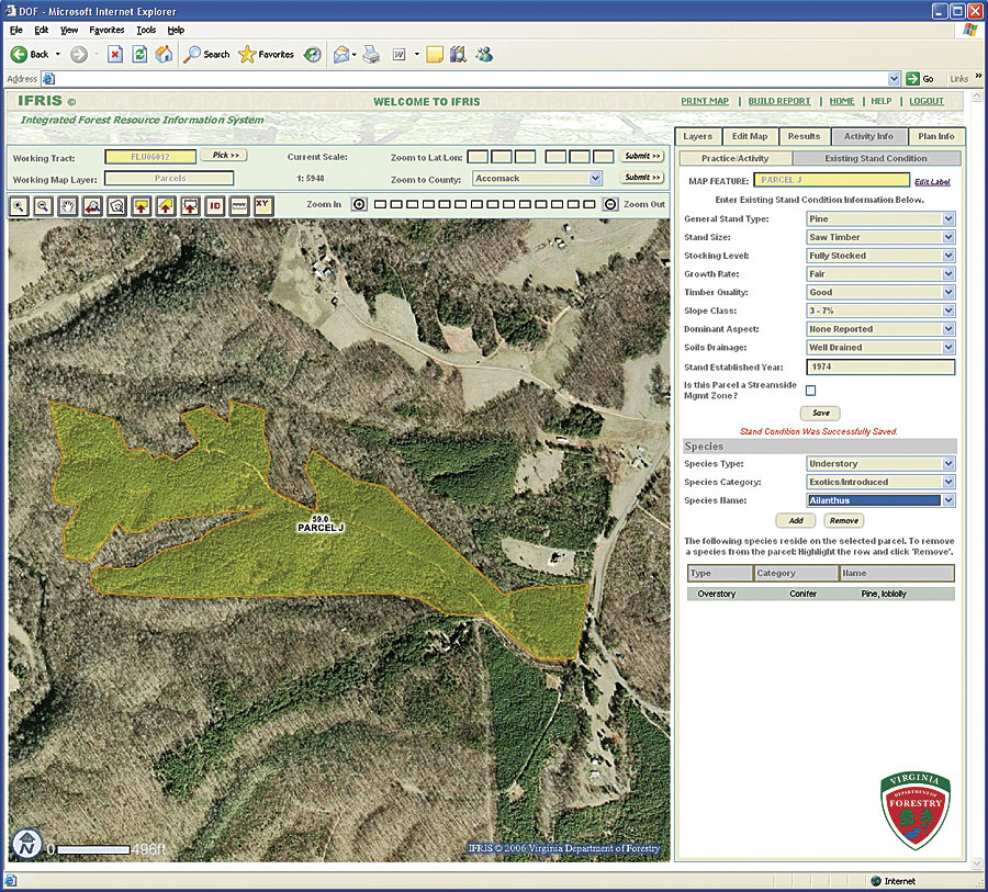 There are more than 15 million acres of forest land in Virginia that require sound management to ensure long-term protection and sustainability of this resource. To this end, the Virginia Department of Forestry (VDOF) provides private landowners with professional forest management advice and assistance in implementing practices such as aerial spraying, prescribed burning, and tree planting. It also assists landowners with cost sharing and through seedling sales. Last year alone, VDOF assisted landowners by developing management plans that covered more than 147,000 forested acres and helped renew more than 80,000 acres through tree planting. Historically, however, the agency's mechanism for tracking information about these many activities has been to input very simple data (e.g., plantingpine50 acres) into a tabular database. Sometimes a paper map was drawn and stored at the county office in a filing cabinet as an accompaniment to the activity, but these maps were not readily available to anyone outside that office. This method has obviously limited efficiency and usefulness in terms of preserving the rich geospatial history of forest management in Virginia. Recognizing this deficiency, VDOF began developing a centralized, Web-based enterprise information system in 2004 that integrates GIS functionality to map a time series of forest management activity and forest stand conditions. This Integrated Forest Resource Information System (IFRIS) makes it possible for VDOF field staff to perform Web-based editing of geodatabases that store geometry of forest management activity areas and existing forest stand type/condition attribution. Users navigate to the property of focus and, using one-meter resolution true-color aerial photography from 2002 as a guide, map (heads-up digitize) what forest management work is being or is going to be performed. IFRIS uses Esri's ArcSDE, ArcIMS, ArcGIS Server, and Microsoft SQL Server to facilitate the creation, editing, validation, storage, and management of spatial data elements. Following intensive evaluation, VDOF contracted with the Timmons Group (an Esri Business Partner headquartered in Richmond, Virginia) for the application development, infrastructure design, and configuration. VDOF hosts the system at Virginia Information Technologies Agency (VITA) facilities. Over time, the extent, occurrence, and types of forest management activities will change. As users modify the mapped features, IFRIS preserves geospatial history through automatic archival of "parent" features and their attributes. This will enable VDOF to re-create not only the forest management activity history but also the change in forest types and conditions through time. ArcIMS is the presentation interface, but it is the ArcGIS Server integration that allows VDOF to deliver true geodatabase feature-editing tools via the IFRIS Web application. Polygon-editing tools include adding/deleting, splitting, merging, appending to, and cutting. There are also more advanced tools that include "exploding" a multipolygon feature into its component pieces, creating a "convex hull" to derive a polygon boundary from selected polygons, and creating interior (island) polygons. Basic point- and line-based editing was also developed. In addition to mapping areas that represent work performed, users have access to a library of annotation layers that they can add to, such as roads, streams, structures, and labels. And, to complement heads-up digitizing data entry, IFRIS was built to allow data captured in the field using GPS to be uploaded into IFRIS.