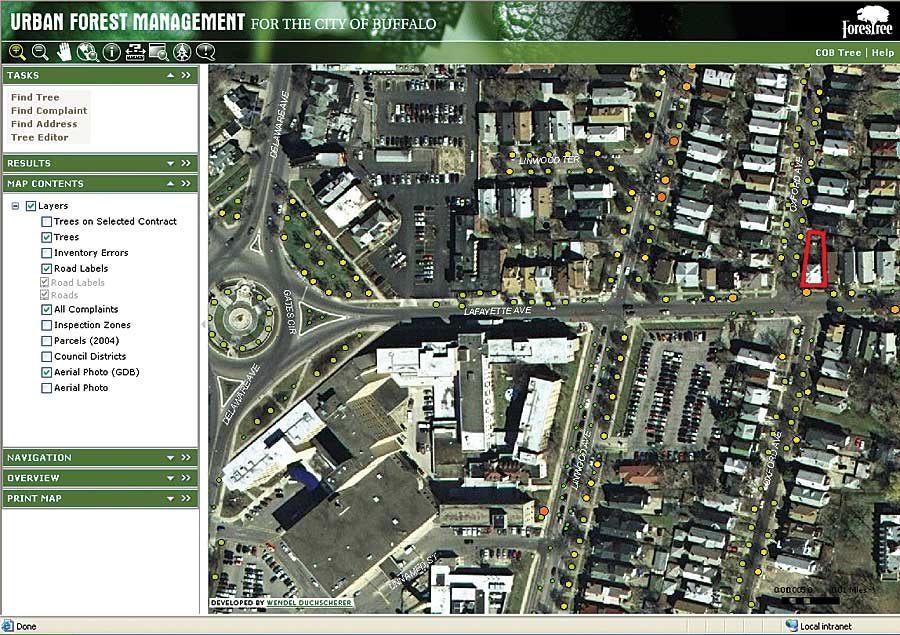 On October 13, 2006, a historic lake-effect snowstorm surprised the city of Buffalo, New York, dumping more than two feet of snow overnight. Two days later, president George W. Bush issued a major disaster declaration for the city and surrounding areas. Federal aid was made available to assist in recovery efforts. Located on the northeast shore of Lake Erie, Buffalo sees an average of more than 93 inches of snow each year. This particular storm event was unique because it happened in early October; most major snowfall does not occur until late November or early December. As a result of this snowstorm, there was widespread damage to roughly 85 percent of the area's trees. This damage was a result of vertical snow loading on fully canopied trees, causing limbs to structurally fail. The falling branches caused excessive damage to cars, houses, and power lines, leaving nearly 400,000 residents in more than 100,000 homes without power for several days. Known as the "City of Trees," the city of Buffalo has maintained a complete urban forest inventory since 2001. This inventory includes all city-owned trees that reside in the public rights-of-way between the curb and sidewalk and also all trees in the city parks. There are 68,000 trees and 108,000 locations included in the tree inventory. After the October storm and the initial clearing of fallen trees and tree branches from the roadways, the city started assessing the condition of the urban forest. Within the first few days after the storm, the city realized that a new system would have to be implemented to assess and inventory all damaged trees throughout the city. The existing tree inventory management system in place at the time of the storm was not capable of supporting the effort needed to assess and update the inventory on such a large scale. Before the October storm, many of the tasks needed to manage the tree inventory were completed using a paper-based system involving the use of paper tickets. Hours of data entry into a central database was necessary after information was recorded on paper forms out in the field. Another consideration for the development of a new system was to improve the city's chances to qualify and receive maximum funding from the Federal Emergency Management Agency (FEMA) for the several-month-long poststorm cleanup effort. Urban Forest Specialists and GIS ProfessionalsWendel Duchscherer Architects & Engineers, with headquarters in Amherst, New York, has been the city's urban forest manager since 2005, responsible for day-to-day maintenance and management of the tree inventory. This includes the issuance and management of annual trimming, planting, and removal contracts; handling citizen complaints regarding street trees; inspecting contractor work; and inspecting and updating information on each individual street tree in the inventory.