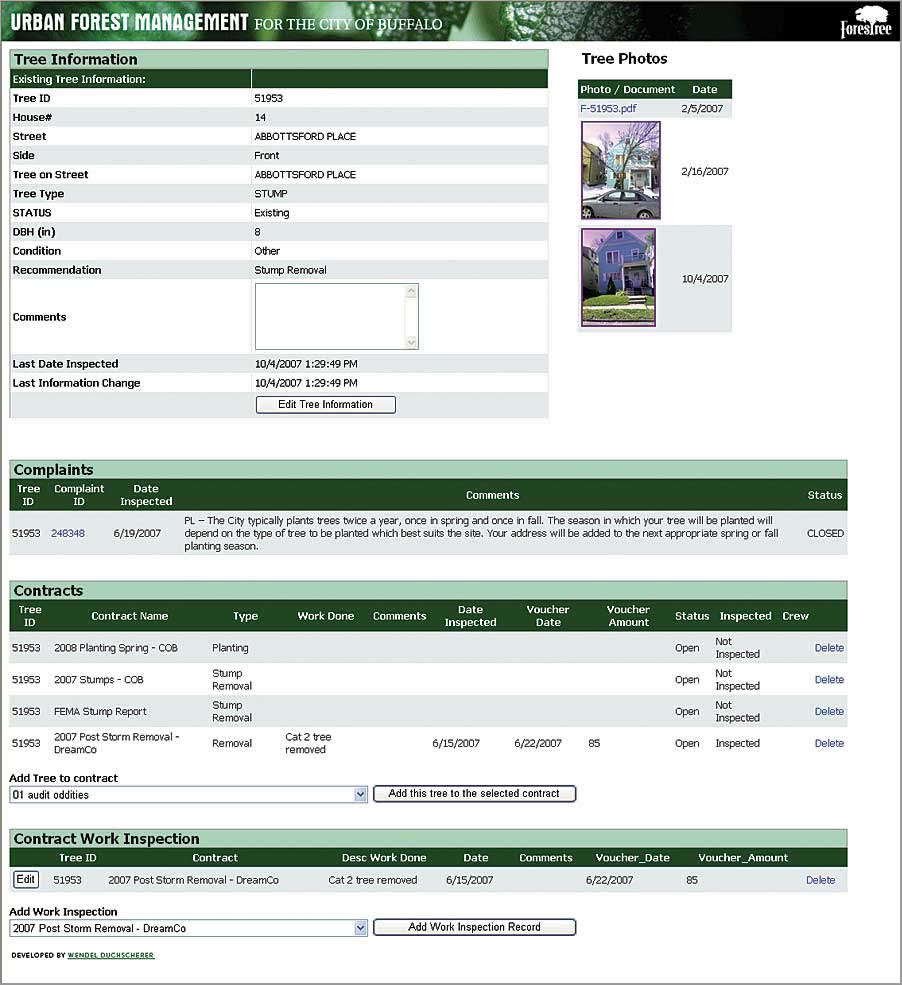 The most complex parts of managing the city of Buffalo's urban forest is editing tree locations and attributes, along with handling complaints submitted by the public. Wendel Duchscherer developed an ArcGIS Web Mapping Application (WMA) designed to efficiently meet these challenges. The urban forest manager needs the ability to edit the location and associated attributes of every tree in the inventory. A tree information tool allows viewing and editing of each tree simply by selecting the tree through the mapping interface. Individual trees can also be added to selected contracts while in the field, eliminating the need to create the contract information at a later time. The city's Web site has a citizen Call and Resolution Center where residents can submit complaints related to city services. Any complaints about city trees are entered into the system by geocoding the address entered on the Web complaint form. These geocoded locations are populated on the WMA site through a nightly automation process. A custom tool was developed that allows the urban forest manager to select an individual complaint and enter the various attributes recorded for response to the complaint. The October storm caused unprecedented damage to the city of Buffalo's tree population and, at the same time, changed the management of its urban forest. The GIS-based Urban ForesTREE Management program now provides the city with an innovative system to manage and maintain its urban forest more effectively and efficiently than everand saves the city money, which is being reallocated to repopulate the trees that were lost as a result of the storm. More InformationFor more information, contact Art Traver, urban forest manager for the City of Buffalo (e-mail: atraver@wd-ae.com), or Jake Needle, GIS manager, Wendel Duchscherer (e-mail: jneedle@wd-ae.com, tel.: 716-688-0766). |