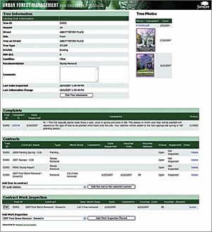 The firm's urban forest specialists and GIS professionals collaborated to develop a GIS-based tree management program to answer the urgent and comprehensive needs of the city resulting from the weather disaster. The program was called Urban ForesTREE Management and was developed utilizing a combination of ArcGIS Server and ArcIMS technologies. When the initial development started two weeks after the storm, four separate groups were identified as primary users of the program: contractors, inspectors, city officials, and the urban forest manager. Each group had a customized Web-based GIS site developed to fit the particular needs and requirements of the work that was completed. By having each site use the same central database, work that was completed on one group's site instantly updated the information on the other three sites. This prevented errors caused by lack of information or delaying communication to the decision makers. The first task after the storm cleanup was to inventory all the damaged trees of the 68,000 existing trees owned by the city. An ArcIMS application was developed by Wendel Duchscherer to run on a Pocket PC that inspectors used in the field to enter data. One of the main considerations when development started was the elimination of paper forms. These forms were re-created as editable Active Server Page (ASP) forms and integrated into the ArcIMS site. This not only helped the field-workers with organization, it also eliminated the need for office personnel to enter the data into the central database. General reference layers (e.g., parcels, aerial photography, roads) were added to the application to help inspectors reference their location when in the field. Through this application, inspectors were able to select a tree on the map and enter updated information directly into the central database. There were up to 10 inspectors in the field at one time after the storm. Another benefit of this system was the real-time display of completed work. Project decision makers and city officials were able to view daily progress and all detailed field information. Once the damaged trees were assessed, they were added to either trimming or removal contracts. The firm then developed another ArcIMS application to help contractors mobilize their crews and track and locate the trees on each particular contract. Organization of the individual contractor information was critical, as more than 100 field crews were working throughout the city at any one time. The ArcIMS site provided the contractors with a map and list of the trees for each of their individual contracts. When work on a tree was completed, the contractor was able to request inspection of the tree through the Web site; the inspection request would be instantly added to the Web application, allowing inspectors already mobilized in the field to visit and inspect completed work sites on a more timely basis. This not only automated the scheduling and work assignments for the inspectors but also expedited the verification and payment process for the contractors.