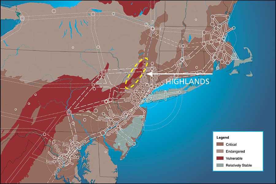 On a warm August day in 2004, Jim McGreevey, then governor of New Jersey, climbed the wall of the Wanaque Reservoir, part of a network of holding pools and aqueducts that flows from the northwest, supplying drinking water to the suburbs that ring New York City, New York, and Philadelphia, Pennsylvania. There, flanked by well-wishers, publicity handlers, and lawmakers, the governor signed legislation aimed to protect hundreds of thousands of acres in the Highlands, perhaps New Jersey's last large, intact ecosystem. "The Highlands has been one of the missing jewels . . . in our preservation efforts . . . ," McGreevey said. "Today is a wonderful day . . . for our environment and our children." Meanwhile, many of the state's foremost environmental leadersthe executive directors of the state chapters of the Audubon Society, the Sierra Club, and many othersboycotted the dam event. Concerned by the signing of a bill that could "fast track" development in other parts of the Garden State, the "greens" held a competing press conference and went hiking in the woods. The hardwood forests of the Highlands where the activists walked that day stretch for nearly 3.5 million acres, over folds of gneiss and granite that undulate north from Pennsylvania, through New Jersey and New York, to Connecticut. This world, occupied for now by the bobcat, black bear, bald eagle, and about 3,000 other species, plays a key ecological role within North America. In the Highlands, several continental-scale ecoregions come together: Here, the Appalachian/Blue Ridge ecosystem that reaches up from Alabama and Georgia ends, mixing with northern ecologies. In this transition zone, the plant and animal species from north and south meet and mix. Ecosystems and species occur here that exist nowhere else. The Highlands, covered with oak, hickory, and ash, or hemlock and red maple in moister spots, provides an important way station for birds migrating up from Central and South America. Warblers, vireos, tanagers, and dozens more stop over here. The Highlands houses more than 300 plant and animal species that the U.S. Fish and Wildlife Service judges of "special emphasis." These hills contain some of the richest ecological communities on the continent: their biodiversity rivals that of the Florida Everglades. While lesser known, the Highlands is even more threatened than Florida's beleaguered wetlands. In part, this is because these low mountains form the backyard of the urban Northeast: More than 15 million people live within one hour of this patchwork of glacial lakes, wetlands, and forested valleys. Each year, more people visit the Highlands for outdoor recreation than all the visitors to Yosemite, Yellowstone, and the Grand Canyon combined. "We don't have the luxury of time in the Highlands," Jeff Tittel, the state's Sierra Club director, has told the press again and again. Nearly everyonefarmers and politicians, developers and ecologistsagrees that the Highlands is important, especially in a state that gets the majority of its drinking water from small rivers that originate in these low mountains. Arguments about preserving the Highlands began almost a century ago. In the last two decades, the debate has grown more strident and polarized: the defenders of private enterprise and property rights on one side, the opponents of sprawl on the other. Really, both sides are right: New Jersey needs key swaths of the Highlands to remain wild. New Jersey also needs affordable homes. In the Highlands and across the country, these competing goals must somehow be reconciled. Yet this will never happen unless voters, businessmen, politicians, and other leaders fundamentally change how they perceive problems like species extinctions, air and water pollution, urban sprawl, global warming, and dwindling resources. Three years after the ceremony at Wanaque Reservoir Dam, the future of the Highlands is far from clear. The state bill remains underfunded: State lawmakers set aside $500,000 for Highlands preservation in 2005 and 2006. However, the Regional Plan Association, a nonprofit organization dedicated to improving life in New York, New Jersey, and Connecticut, says as much as $1 billion may be needed by 2014 to save critical parcels. Lack of money may be the most obvious problem. But these budget shortfalls would not be tolerated if not for something that threatens the Highlands even more: lack of vision and understanding. If we're going to save the Highlands, or any other threatened ecosystem in North America, we need a fundamental shift in perception. We need to place these regions in their larger contexts, to recognize that they are not islands. How does the Highlands fit into the continent's ecology? How do regional and continental human systemsroads, real estate, economic corridorsoverlay the natural systems? These sorts of big-picture questions are missing from the dialogue. Though more than 150 environmental groups have joined the Highlands Coalitiona group of organizations fighting to preserve the regionand dozens of scientists are studying the ecosystems and impacts of development there, none of these efforts takes on the region's natural and man-made systems as a whole. None examines how the region might work as an integrated system, both ecologically and economically. Studies of environmental impacts examine problems species by species, place by place, or problem by problem. They form a patchy mosaic of information, not a coherent scientific picture. Even the Highlands Coalition divides its efforts by state. Development, while mapped by region, is approved and funded one project at a time. Yet the Highlands desperately needs an overarching vision: More than 80 percent of the critical open land in the Highlands is already fragmented into private parcels and thus more vulnerable to development. Meanwhile, the Highlands' population is growing 50 percent faster than the statewide rate, according to the state Department of Environmental