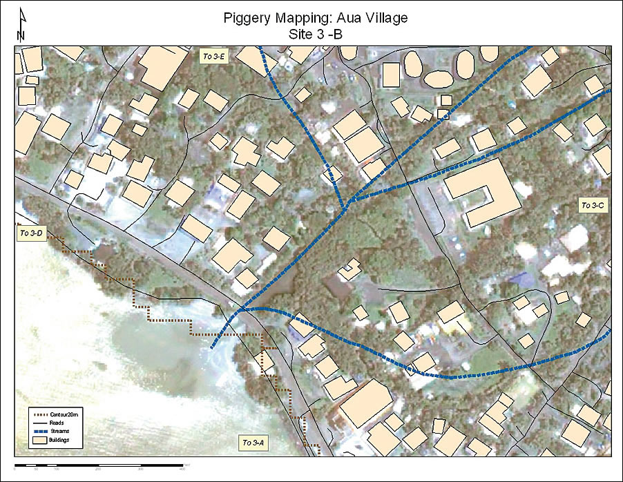 The raising of pigs in American Samoa represents an important part of the Samoan culture. Pigs are consumed during a variety of social events, from birthdays to funerals and from weddings to farewell parties. However, pigpen (piggery) waste disposal has been largely uncontrolled, resulting in volumes of untreated pig urine and feces contaminating drinking water, streams, and nearshore ocean water. The impacts of pig waste on human health and water quality are now critical, and illness and death due to pig-related disease are documented. In April 2006, the American Samoa Environmental Protection Agency (ASEPA), in an attempt to regulate this nonpoint source pollution, launched the Piggery Compliance Program. The purpose of this program is to inventory all existing piggeries, educate piggery owners on safe practices for the raising of pigs, and enforce the current regulations. The goal of the program is to legalize those piggeries that are compliant with current regulations and to relocate or remove all noncompliant piggeries that represent a threat to human and environmental health. In a country where physical addresses do not exist, GPS and GIS technologies were essential for the success of this program. The exact location of each piggery was acquired using GPS units, while information regarding each piggery was easily stored, edited, and retrieved using GIS technology. American Samoa is a U.S. territory located in the South Pacific between Hawaii and New Zealand. It is made up of five islands and two atolls with a population of 60,000 people, most of whom live along the coast of the main island, Tutuila (approximately 130 square kilometers). American Samoa's lifestyle was based on traditional customs and a subsistence economy until the 1960s, when President Kennedy made funds available to modernize the territory and jolted its people into 20th century life. The population has tripled since then, and a new issue has arisen: stream water once used for household chores is now contaminated by fecal bacteria. In April 2006, ASEPA personnel and volunteers from other agencies (a total of about 30 persons) were trained to use the three Trimble XP GPS units available. They visited each house and road of the territory, recording piggery and solid waste locations, educating piggery owners, and collecting piggery and owner information. ArcView was used in the two different phases of the piggery compliance program: phase 1, inventory and education, and phase 2, enforcement. Before the fieldwork, the teams were given paper maps of the area to survey, where they wrote notes on piggeries and solid waste locations and checked the visited houses one by one. This step was very important in case of GPS failure or misuse. QuickBird satellite images were also used to identify structures that did not appear in the available GIS shapefiles. Pathfinder Office software was used to create a data dictionary to assure the systematic and correct collection of the data for each piggery. It was also used at the end of each working day to download, differentially correct, and export the data into a personal geodatabase. Data was collected using TerraSync software. Editing to correct wrong locations (the point was taken at a distance from the piggery) and spelling mistakes was also done on a nearly daily basis. ASEPA surveys found approximately 8,300 pigs contained in 1,005 piggeries, of which only 3 percent were compliant with current regulations. After the inventory/education phase, spatial analysis was used to identify those piggeries that represented a major threat to human health, focusing on those located within 50 feet of streams in highly populated villages. The database was also enlarged to contain information regarding enforcement action for each piggery. The geodatabase is essential for a rapid retrieval of data, and it is used to identify and relocate piggeries after complaints and to track warnings, citations, relocation, and removal of piggeries during the enforcement phase of the program (phase 2).