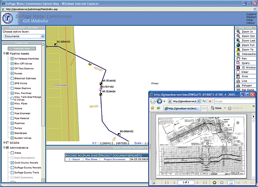 The commission began operations in 1991. By 2004, the decision was made to upgrade the existing information management system of hand-drawn maps, road atlases, and "corporate memory." Following the recommendations of an engineering firm hired to do a needs assessment and implementation plan, the commission defined the GIS layers and datasets it needed, consolidated data, and hired GIS coordinator Frank J. Frelka. With a background in public works, Frelka first attempted to adapt the system to one of Esri's water distribution data models, a collection of objects, feature classes, and attributes defined for water and wastewater distribution networks. Typically, the model can be tailored to meet project requirements for data management and integration with other systems. The DuPage water distribution network, however, was not typical. "It certainly made sense to me to use a water distribution model, but it was not a good fit," Frelka says. "We had 27 customers instead of thousands. The feature classes, such as service laterals, fire hydrants, and commercial and residential customers, didn't apply to us." Remembering a presentation at the Esri International User Conference a few years back, Frelka took a look at data models on the Esri Web site and discovered the ArcGIS Pipeline Data Model (APDM). APDM was designed for storing information pertaining to features found in gathering and transmission pipelines, particularly gas and liquid systems. After reading the white paper and studying the model, Frelka decided APDM was the solution DuPage needed. It met the commission's primary objective to account for linear referencing of features. From APDM's 50 feature classes, Frelka extracted the 15 he needed and defined an additional 20. Because water transmission runs under a less intense regulatory environment than flammable fluids, Frelka used a small fraction of the APDM attribute fields. "With APDM it is possible to select and work with only the features you need," Frelka explains. "With the model, dynamic events and static features can also be held. I realized that events are used for dynamic situations. This was a static situation." Starting with as-built drawings of the system, Frelka converted data into the GIS. He "eyeballed" pipelines using DuPage County centerlines and aerial photos. The pipelines were snapped to GPS points taken by survey every 500 feet and at every visible structure, such as manholes and electric cabinets. He created routes from the pipeline features; this involved a pipeline calibration using more than 400 known locations of valves and manholes. "The lines were converted to routes, and we assigned measures to the lines," Frelka says. "Then we had to learn about calibrating routes working from known locations along the route with associated station values based on linear feet. There are several different types of stationing, but the most practical was flat 2D linear stationing. The surrounding terrain in the area is essentially flat. Things get complicated with station equations and routes." Once Frelka had the routes, he developed event tables of asset locations from the as-built drawingselevations, station values, valve locations, manholes, bends in the pipe, blow-off valves, system valves, CP test stations, and casings. He made the table in Microsoft Excel and imported it into ArcGIS Desktop. With linear referencing, Frelka was able to develop an ArcIMS application that opens as-built drawings for the specific section of the pipeline selected. "I started with event tables, because all we had was tabular data," Frelka comments. "Using an event table gave us the ability to create feature classes. The system is static, which lends itself to out-of-the-box tools. Then I read the Esri Press book Linear Referencing in ArcGIS and went through the exercises. I found it was exactly what I needed for what I had to do." More InformationFor more information, contact Frank J. Frelka, DuPage Water Commission (e-mail: ffrelka@dpwc.org, Web: www.dpwc.org), or Peter C. G. Veenstra, director of product development, Eagle Information Mapping, Inc. (e-mail: pcgv@eaglemap.com, Web: www.eaglemap.com). |