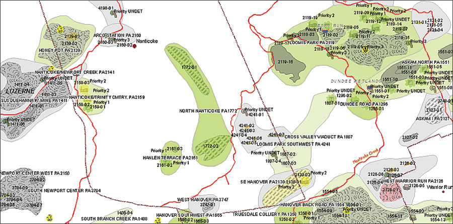 As recently as 30 years ago, coal mining companies weren't required to clean up and restore the land they excavated. Streams ran orange, green, and white with heavy metals leached from nearby mines. Strip pits with sheer cliffs were a hazard, causing many people to fall to their deaths. Pennsylvania was left with more than 200,000 acres of mine-scarred land and 5,000 miles of polluted streams. As the impact of surface mining became evident in the mid-1970s, Congress passed the Surface Mine Control and Reclamation Act (SMCRA) in 1977. SMCRA attached a per-ton fee to all extracted coal to create an interest-accruing federal reclamation fund. The fund is maintained by the United States Department of the Interior Office of Surface Mining (OSM) and is dispersed to states and Native American tribes that still face problems caused by coal mines abandoned before 1977. Because Pennsylvania leads most states in the amount of reclamation that needs to be done, in 2006, Congress authorized an increase in Pennsylvania's reclamation allotment to $1.4 billion over the next 15 years. With so many abandoned mines still awaiting reclamation in Pennsylvania, EPCAMR sought a way to more efficiently pinpoint the areas in need of remediation. Although the new allotment will significantly increase the work that can be done, $1.4 billion still needs to go a long way. With a grant from the Foundation for Pennsylvania Watersheds and an agreement with the OSM's Technical Innovation Professional Services (TIPS) Program, EPCAMR used ArcGIS Desktop software's ArcMap and the Publisher extension to create a tool to keep track of abandoned mines. Called the Reclaimed Abandoned Mine Land Information System (RAMLIS), the application creates highly detailed maps at different scales with layers of information that help identify the areas most in need of remediation. RAMLIS also combines state, federal, and local data in maps that reveal all the components of mines, such as mine discharge points, backfilled strip pits, and reclaimed mine shafts. To work safely and effectively, reclamation crews must know the location of these features. Knowing the location of flooded voids, for example, can potentially save enormous expenseand even lives. The dynamic, interactive maps assist reclamation efforts because they allow the public and local municipalities to understand what features are contained within a mine site and which features can be fixed using SMCRA funding. Map layers show a multitude of problems caused by leaving mines unattended. For example, the quality of water running off these sites is identified in a stream layer from the Pennsylvania Department of Environmental Protection (DEP) called the Integrated List of Waters. This layer shows streams that do not meet their intended use because pollution from the seepage of mining by-products drains into the stream. By turning on this layer, users can see certain sections of a stream that are impacted by mine drainage of heavy metals, such as iron or aluminum, into the stream. Toxic discharge from this runoff also decreases the pH to uninhabitable levels for fish and other aquatic organisms.