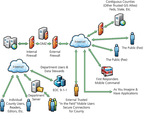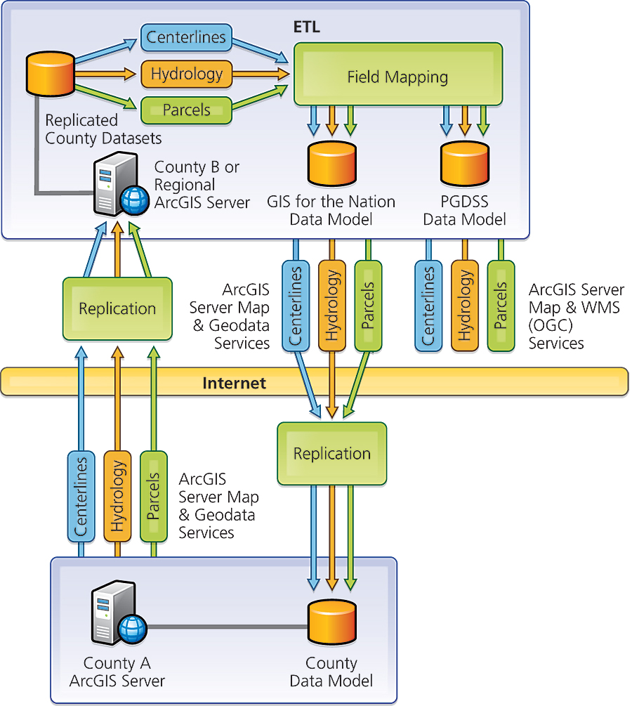 In Pennsylvania, the state's 67 counties are grouped into nine counterterrorism task forces for improved emergency management. Though the task forces were created in the wake of the 9/11 attacks on the United States, they serve not only to strengthen homeland security coordination but also to facilitate quick responses to natural events, such as flooding. For years, counties in the state have realized the importance of sharing geographic data for enhanced emergency response and have looked for ways to orchestrate it. Sharing GIS data would also provide backups to a county should its infrastructure become compromised during an emergency. Additionally, a county could use the data of neighboring counties in daily activities. Though many counties use the same ArcGIS platform, they maintain data in varied formats according to different business requirements, which historically created data-sharing barriers. When ArcGIS 9.2 was released at the end of 2006, product enhancements made data sharing easier. With geodatabase replication and the ArcGIS Data Interoperability extension that came out with ArcGIS 9.2, three counties in Pennsylvania—Clinton, Lycoming, and Union�began to look at how they could share locally maintained GIS data, such as road centerlines and tax parcels. The remaining four counties—Bradford, Potter, Sullivan, and Tioga—in the North Central Counter-Terrorism Task Force joined the effort as did Centre, Luzerne, Wayne, and Mifflin. The Pennsylvania Federated GIS pilot project was under way, with the Pennsylvania GIS Consortium offering funding and guidance. Creating a Resilient Federated GISA federated GIS is based on a distributed collection of connected GIS nodes that share and use each other's geographic information and services. In this case, a county's enterprise geodatabase serves as a node. ArcGIS Server 9.2 enabled this architecture with replication, which allows copies of a geodatabase to be distributed to other counties' GIS based on an agreed-upon schedule that could be monthly, daily, or more frequently. During a crisis, updates can be made in near real time. The Pennsylvania Federated GIS was designed to be resilient: if one county's GIS data becomes inaccessible in a crisis, it is still accessible at other locations in the state. Other servers in this connected group could immediately stand in for a disconnected node. From a remote location, the disconnected county's replicated data will run seamlessly in GIS applications. To achieve this resilience, the Pennsylvania Federated GIS is decentralized. A central server would make participating counties depend on one county, or one physical location. In the event of an emergency that debilitated the central server, there wouldn't be a backup.