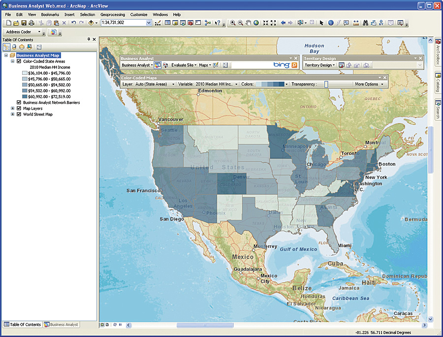 Business Analyst is available for use on the desktop and as a server-based, collaborative solution. New with the 10 release is Business Analyst Desktop Premium. This premium version contains everything in the standard version plus more demographic, business, consumer spending, and market potential data, along with all the segmentation tools from the Segmentation Module, as well as the full version of Address Coder software for geocoding and data appending.